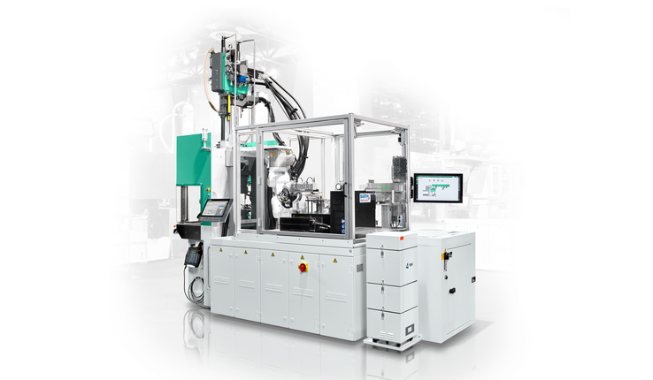 The compact turnkey system for the automated overmoulding of inserts and traceable part production is a sophisticated manufacturing solution with high autonomy. The consistent use of digitalisation solutions allows the individual process steps to be linked via a continuous data and information chain, enabling seamless tracking of part quality and output.