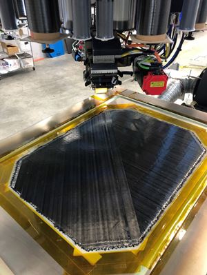 A joint advancement between Electroimpact, Toray Advanced Composites, and Janicki Industries has achieved a leap forward in the high-speed manufacture of large thermoplastic composite parts. The project has resulted in the extension of automated, cost-effective processing technologies that can manufacture large-scale thermoplastic parts at high-speed deposition rates of up to 4000 inches (100 meters) per minute.